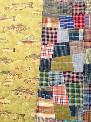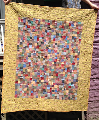 I made this top last June and finished the binding this morning. Quilted by Suzette Fisher with a scarlet thread. Made from deconstructed shirts and bound with 4 pieces of leftover green binding from other projects.